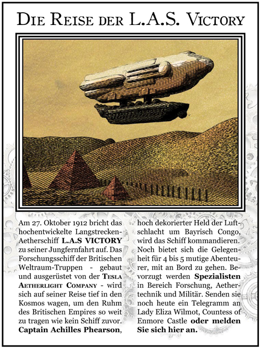 Somit wäre noch Platz für 3 mutige Abenteurer an Bord der L.A.S Victory. Evtl. findet sich auch noch eine Behelfskoje im unteren Kesselraum.