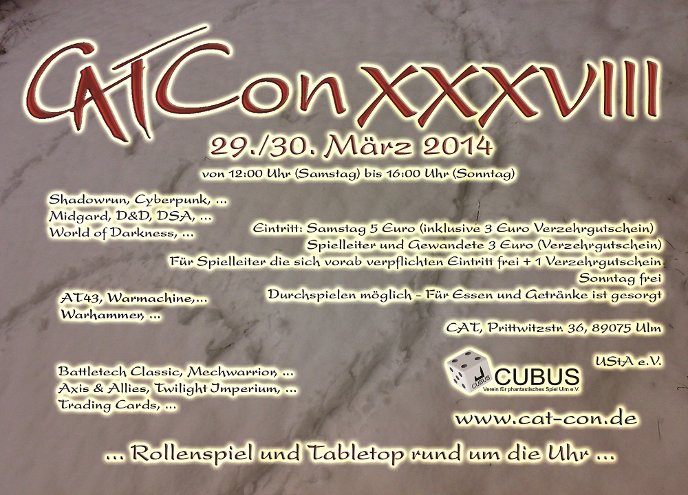 Die findet nämlich wieder am 29./30.3. in den Gewölben des Cat statt! Von Samstag 12:00 bis Sonntag 16:00 kann wieder durchgespielt werden. Cubus-Mitglieder haben auch diesmal wieder freien Eintritt, allerdings möchten wir die Orks bei dieser Con natürlich auch so gut wie möglich unterstützen