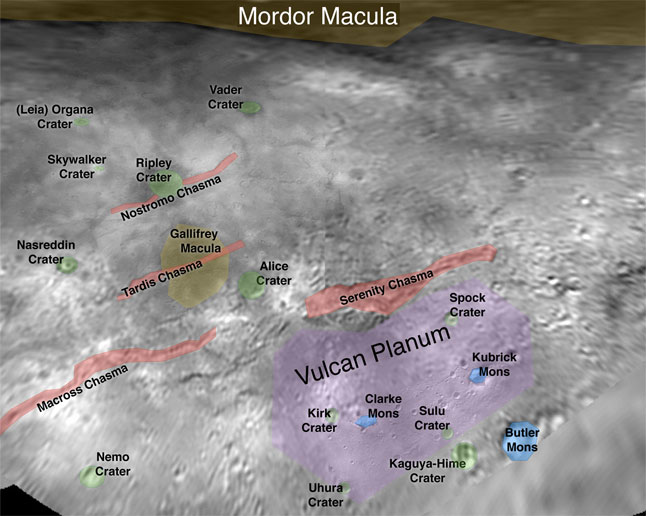Der Jubel des Volkes wird Euch sicher sein, genauso wie ein schöner Orden und monatlich ein paar zusätzliche Verpflegungsmarken. Hoch lebe die Freie Volksrepublik Euroluna, das Juwel der Erde!P.S.: Neues von der Pluto-Front. Nun wurden auch die Namen für Geländemerkmale auf Charon, Plutos größtem Mond, veröffentlicht.