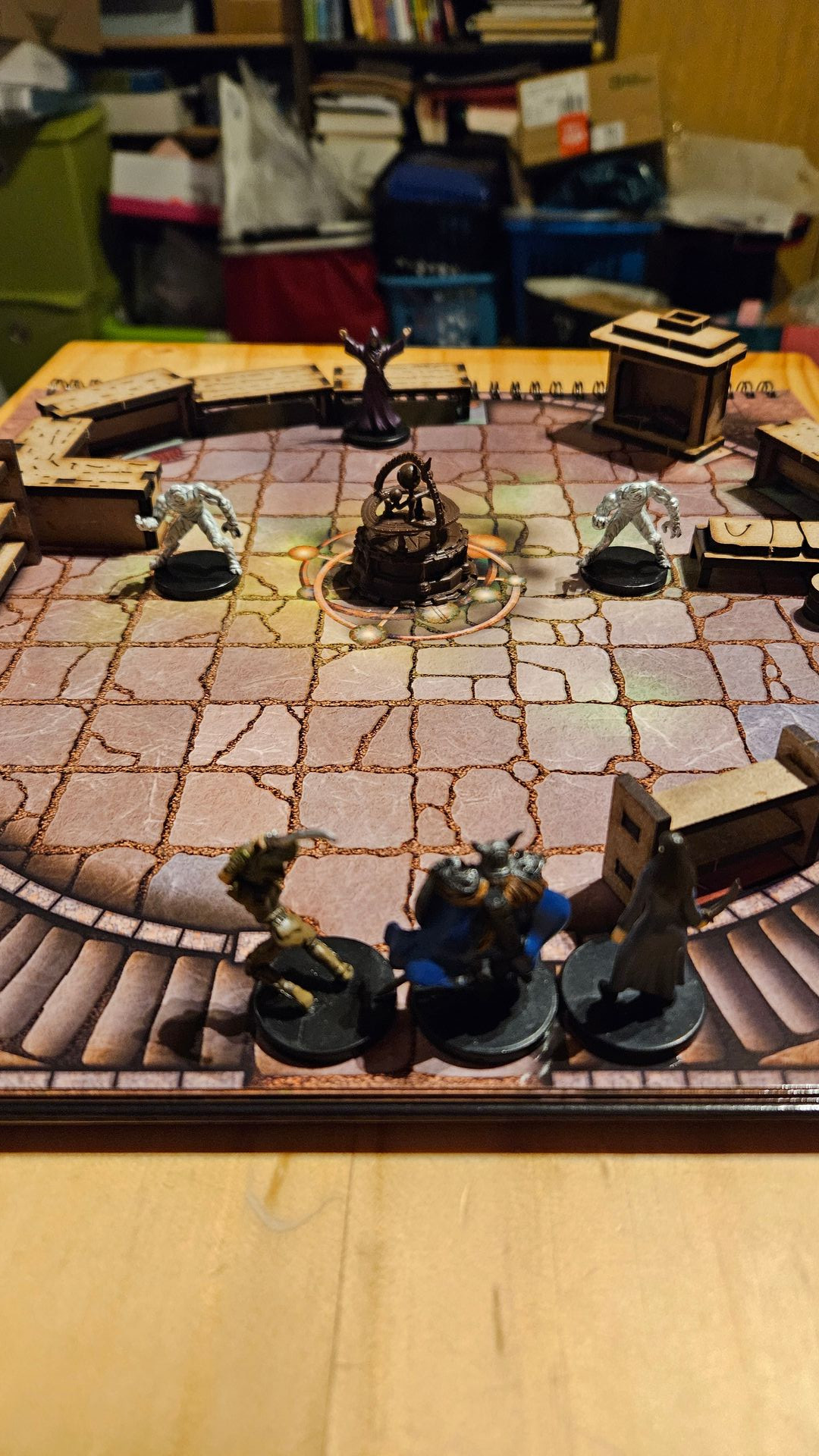 Vorsichtig wurde die Tür geöffnet. Vor den Helden war ein Raum mit einem Orbitarium in der Mitte. Die Bücherregale und Labortische ließen keinen Zweifel, dass es sich um ein Magierzimmer handelte. Eine berobte Gestalt stand auch am anderen Ende des runden Raumes hinter dem Orbitarium. Als sich die Helden näherten, drehte sich der Mann um. Er deutete auf Dolorita und sprach sie mit einem Rashduler Akzent an. „Sie hat gesagt, dass ich deinen Kopf holen soll. Das sei mein einzig wahrer Wunsch. Ich halte das für eine großartige Idee.“ Mit einer kreisenden Bewegung seiner Arme sprach er weiter: „kommt meine Kinder und bringt mir den Kopf dieses Hexenweibes!“ Auf dem Boden floss Staub und Sand zusammen und zwei Fließsandgolemiden erhoben sich zu beiden Seiten des Orbitariums.